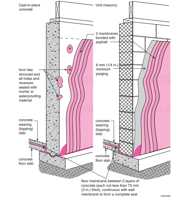 Waterproofing works together with footing drains, drainage boards, and grading to manage groundwater and surface water.