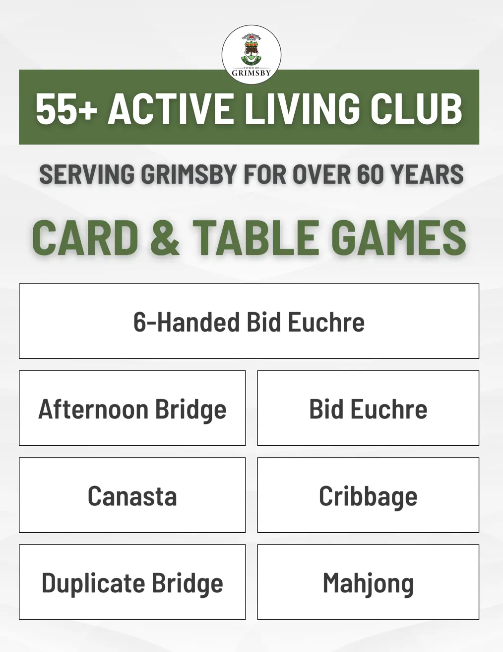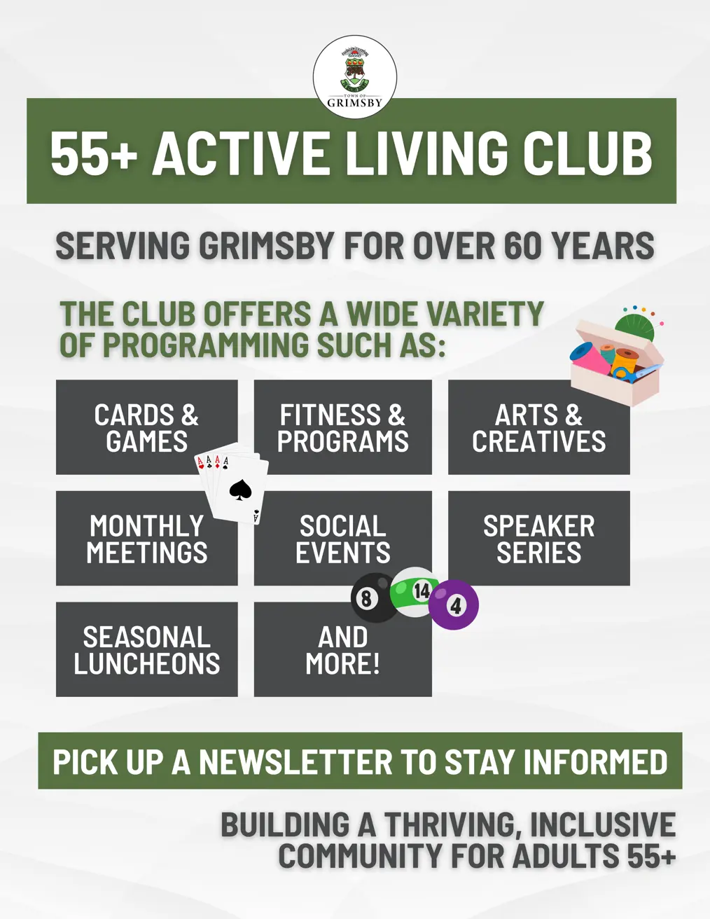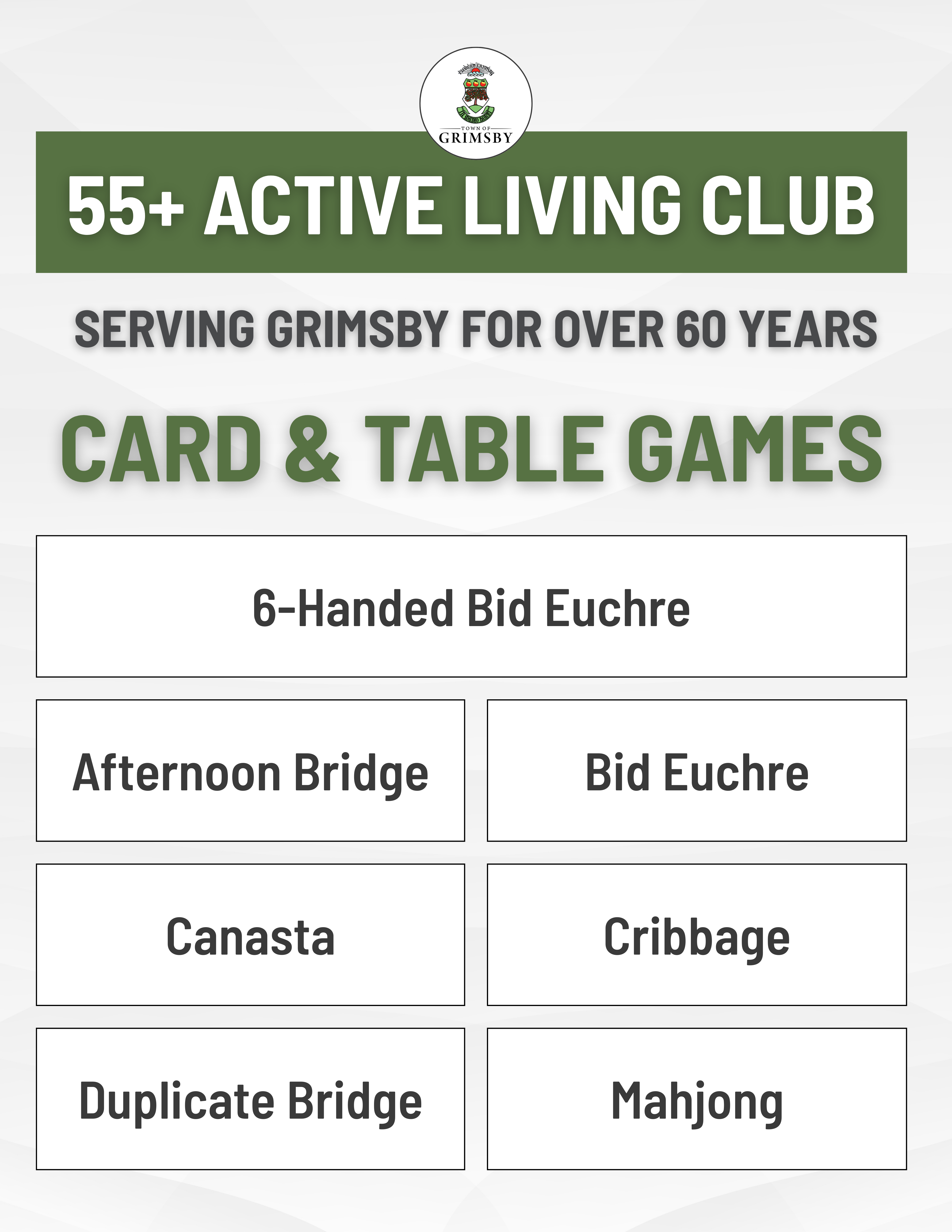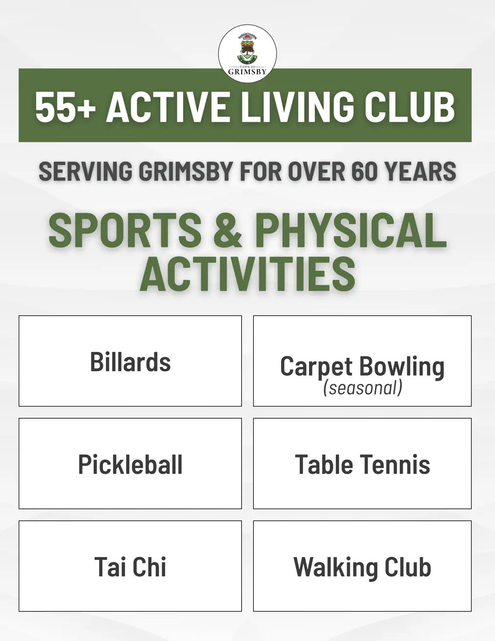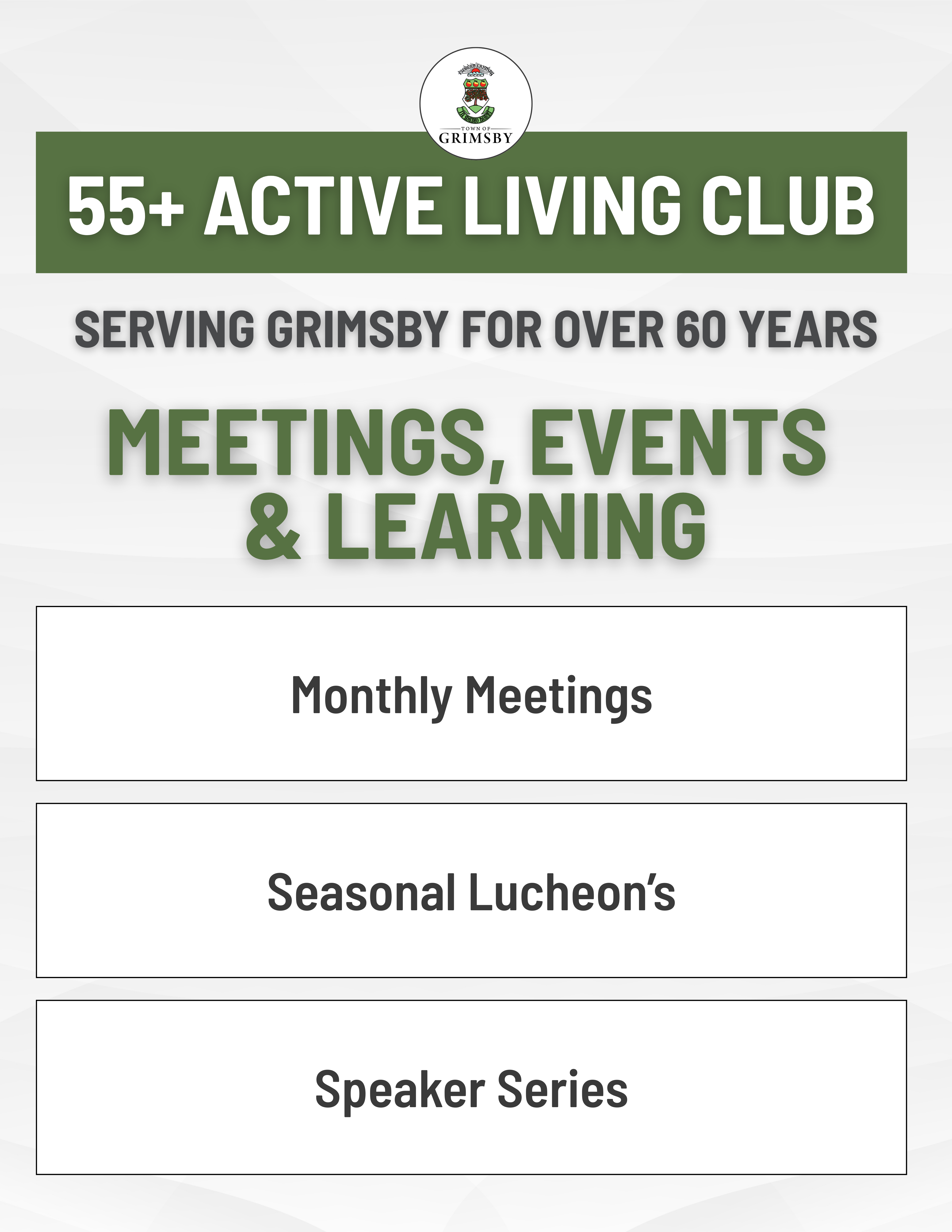 The 55+ Active Living Club, formerly the Grimsby Seniors Club, has been a vibrant part of the community for over 60 years and now operates out of the Major Refrigeration Peach King Centre. The Club offers adults aged 55 and over opportunities to stay active, social, and connected through a wide variety of programs and activities.