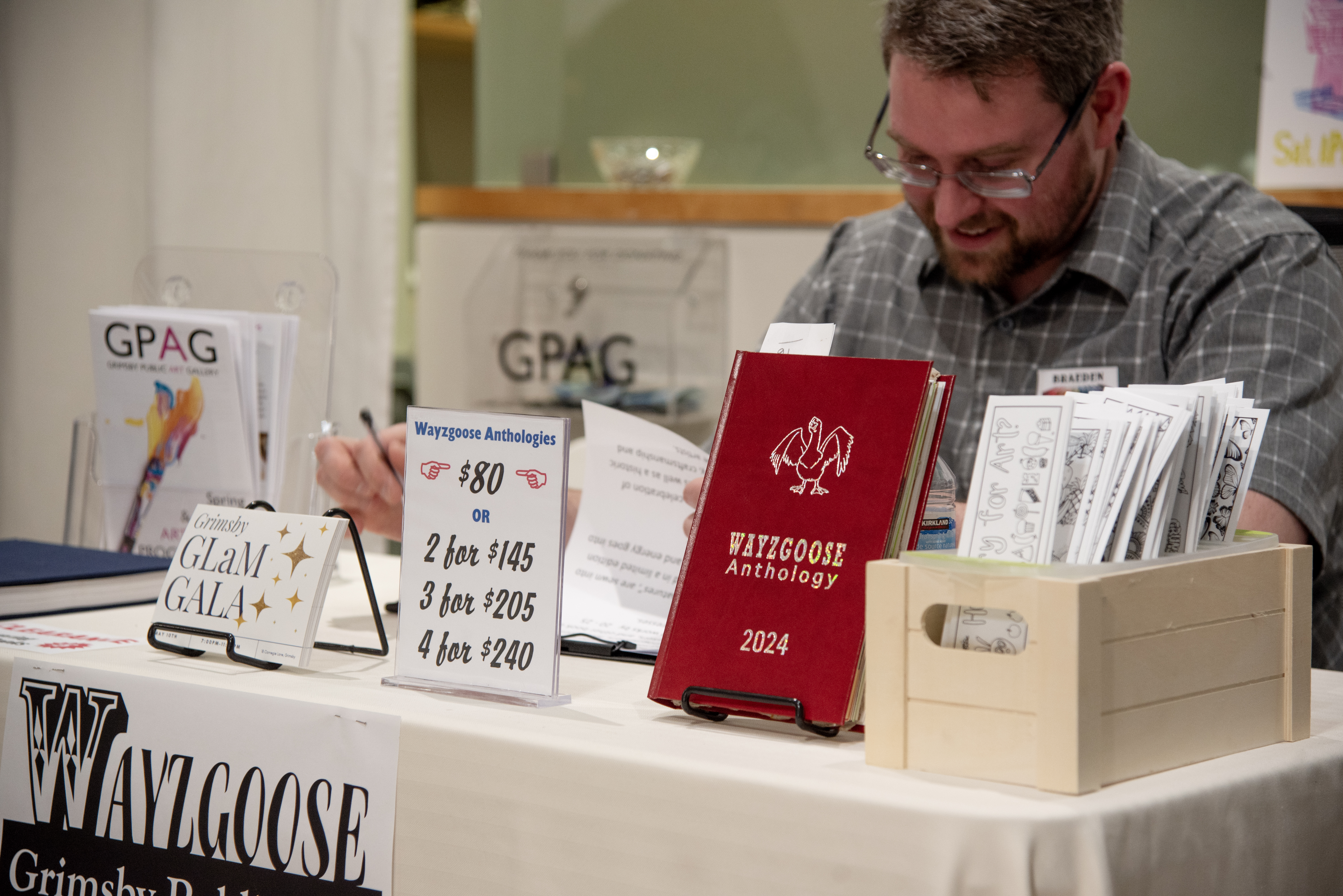 The 2024 Wayzgoose Anthology, as well as many back issues, are currently available to purchase for $80 (includes HST). Shipping is extra and is dependent on where you live. If you would like to purchase this unique work of art, want to know what years are still available, or would like a shipping quote, please contact the Gallery gpag@grimsby.ca or 905-945-3246.